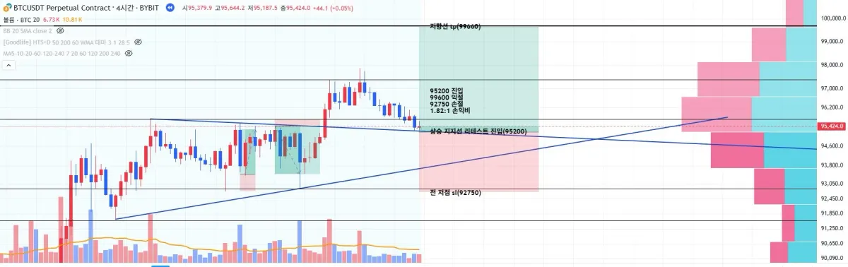 복기하겠습니다. 상승 추세선을 이탈 후 다시 리테스트하는 자리에서 계약 체결하였습니다. 97900 고점을 찍고 거래량이 말라가는터라 눌림으로 예상하고 진입했습니다만 생각보다 하방압력이 심하여 처음에는 물리고 시작하였습니다. 하지만 전 저점 저항 및 전 저점 이탈하지 않는다면 일봉 및 4시간봉 다우이론 상 상승구조였기에 상승할 것이라 예상했습니다. 꾸준히 기다린 결과 tp값에 도달하여 익절할 수 있었습니다.