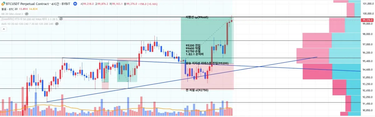 2025년 5월 4일 22시 46분 롱 포지션 체결되었습니다. 5월 8일 17시에 익절되었습니다. 손익비는 1.8:1입니다.