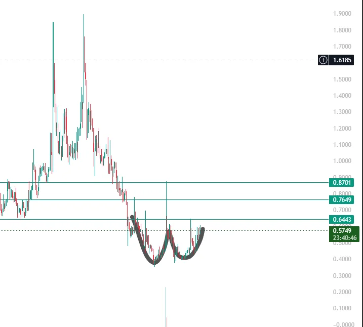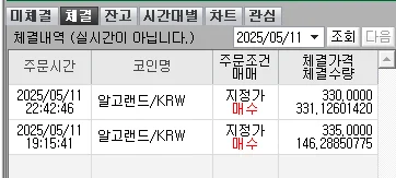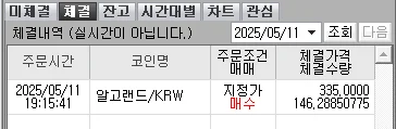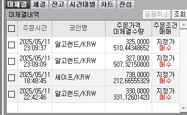 챠트에서 배운 헤드앤솔드 패턴을 발견하여 알고랜드를 소량 매수 하고 330 원 부터 매수를 촘촘하게 걸어둔 상태 입니다.