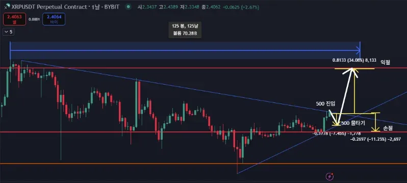 step 2) 추가하락이 나와 상승추세 하단까지 올경우, 나머지 2배 long 물타기