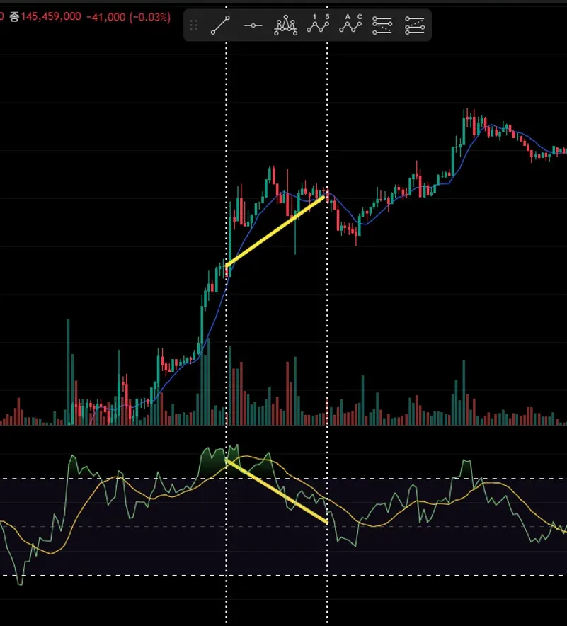 다이버전스가 일어난다는 것은 조만간 가격이 꺾인다는 것을 의미하기 때문에, 손익비가 좋은 자리이기도 함.