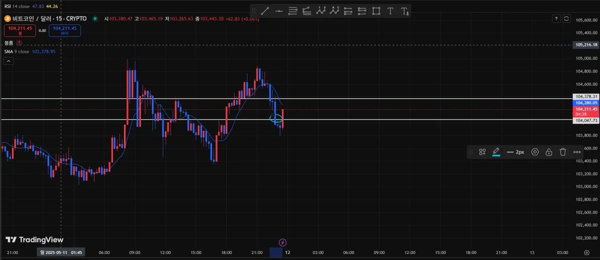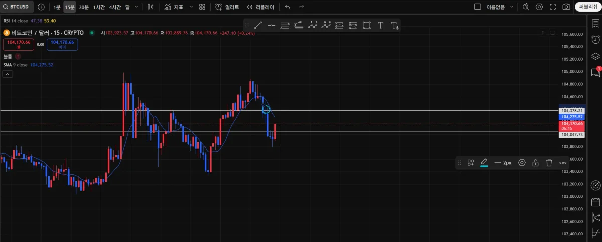 지지선과 저항선을 간단히 그린후 위에 보면 하늘색원에서 떨어지는 것을 보고 숏진입했습니다.