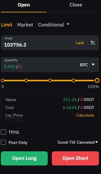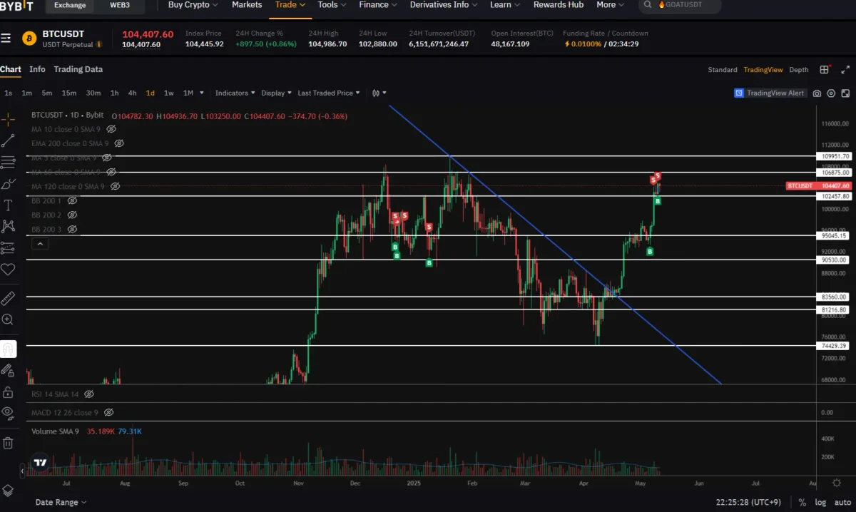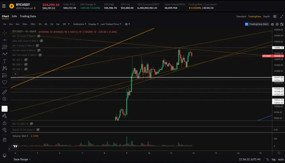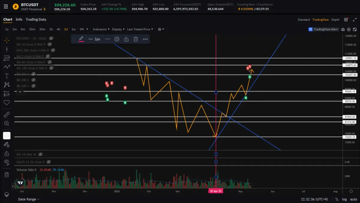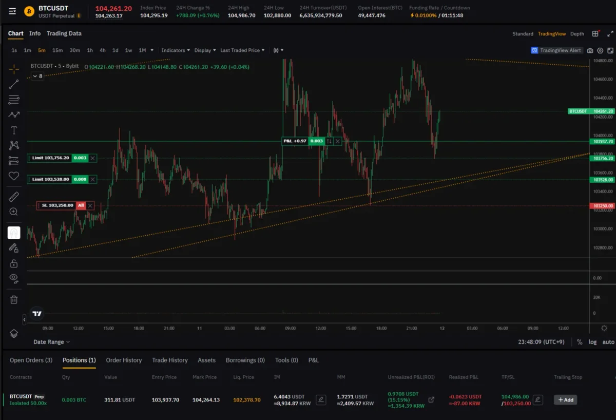 take profit은 위에서 봤던 흰색 저항선 까지 104986로 설정했습니다.