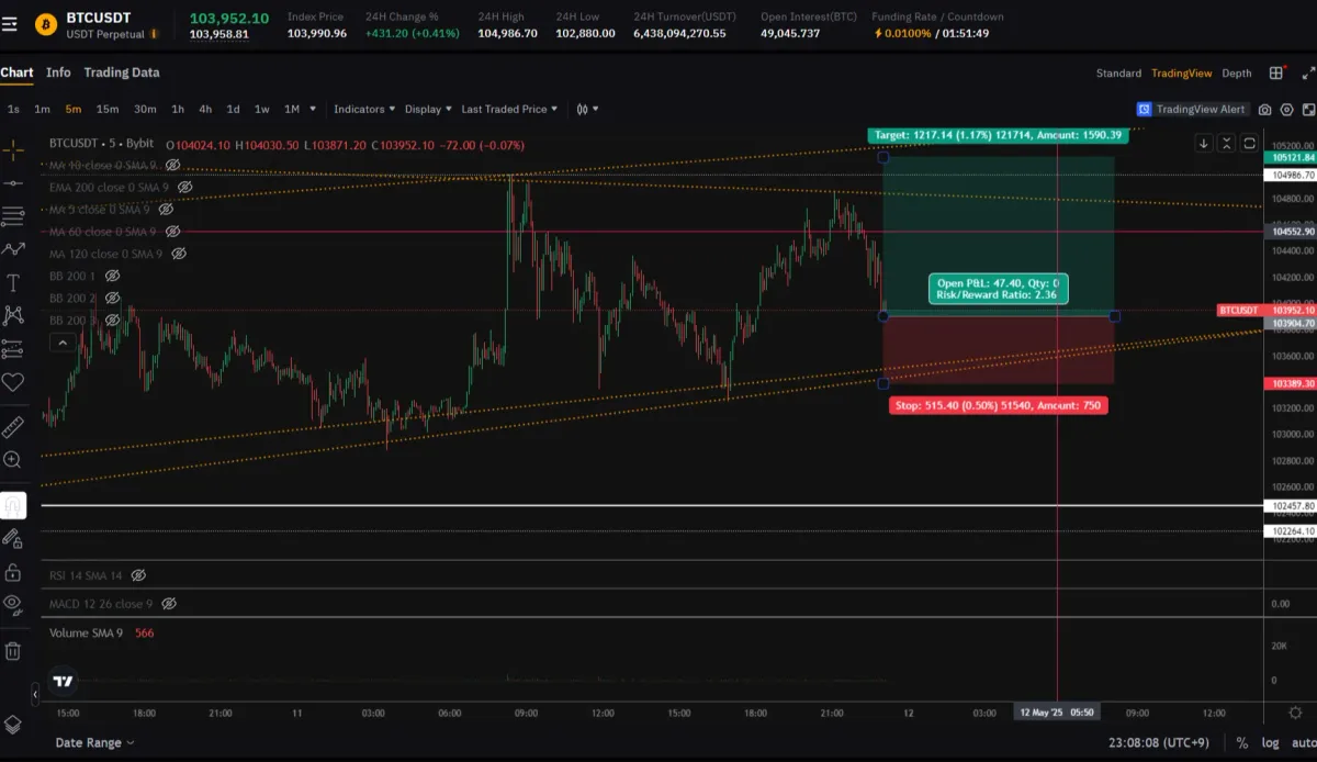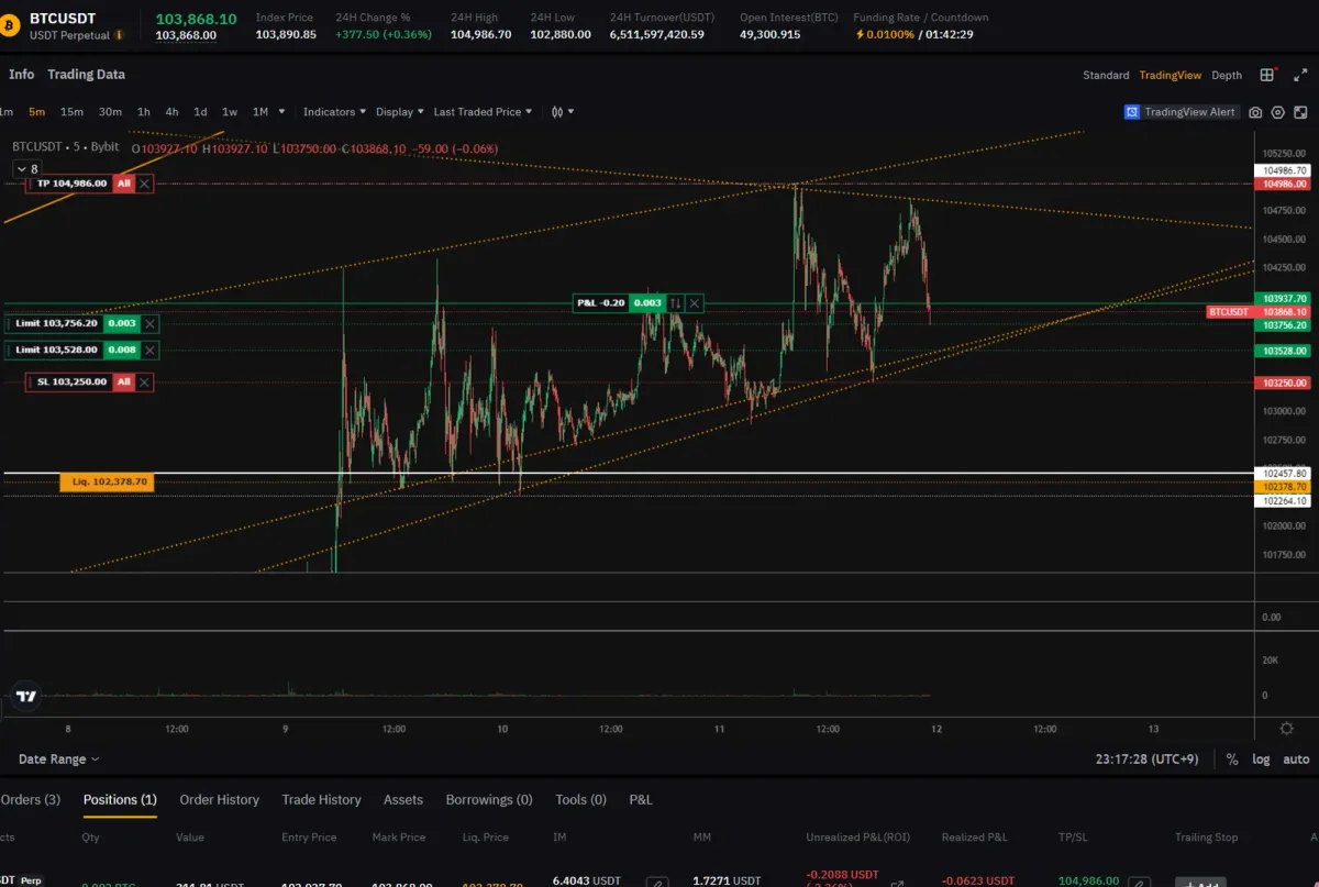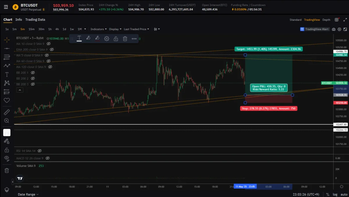 stop loss는 5분봉상 이전 저점 가격대로 103250 설정했습니다.
