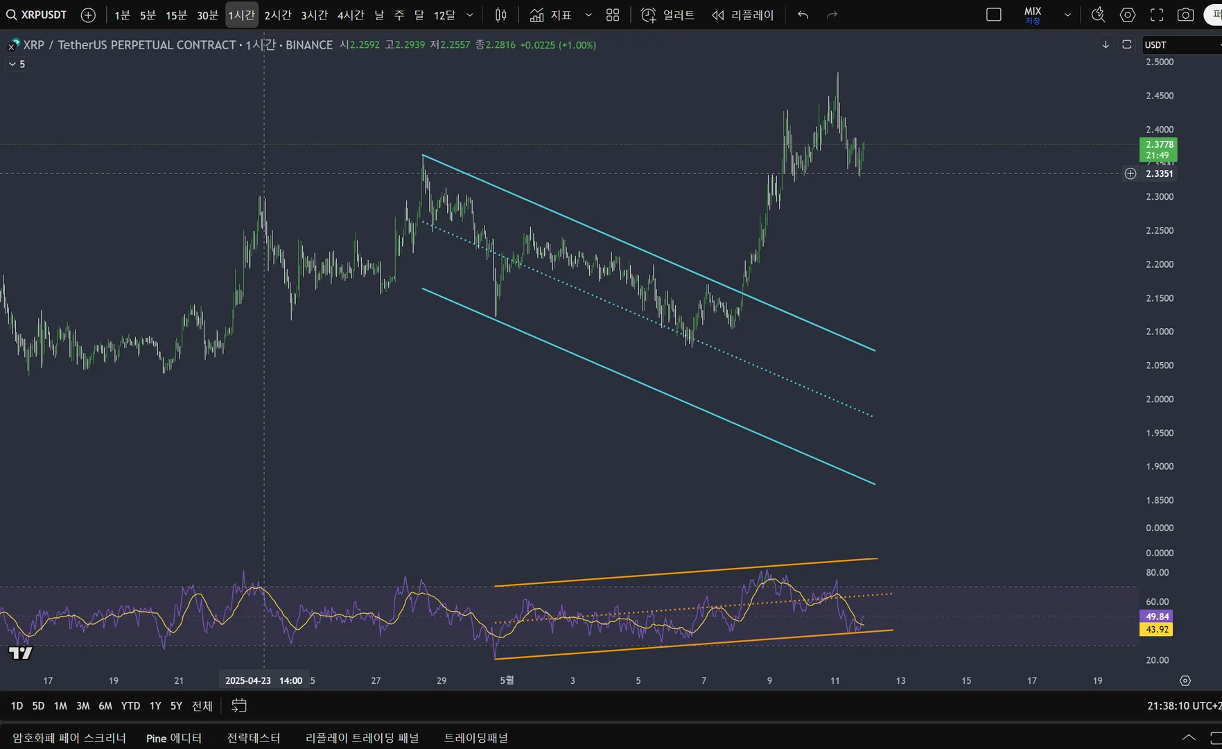 5월 초부터 오늘 현재 시점까지 XRP RSI 다이버전스를 확인했습니다. 가격의 저점은 낮아지고 있는데, RSI는 상승 채널을 만들고 있네요.