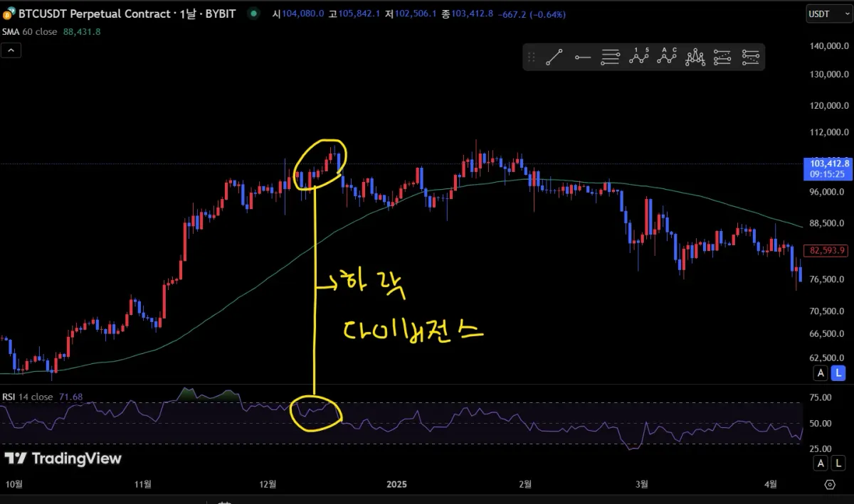 BTC 차트의 작년 12월 고점 때 오히려 하락 다이버전스가 나오는 점 발견 ~! 했습니다.