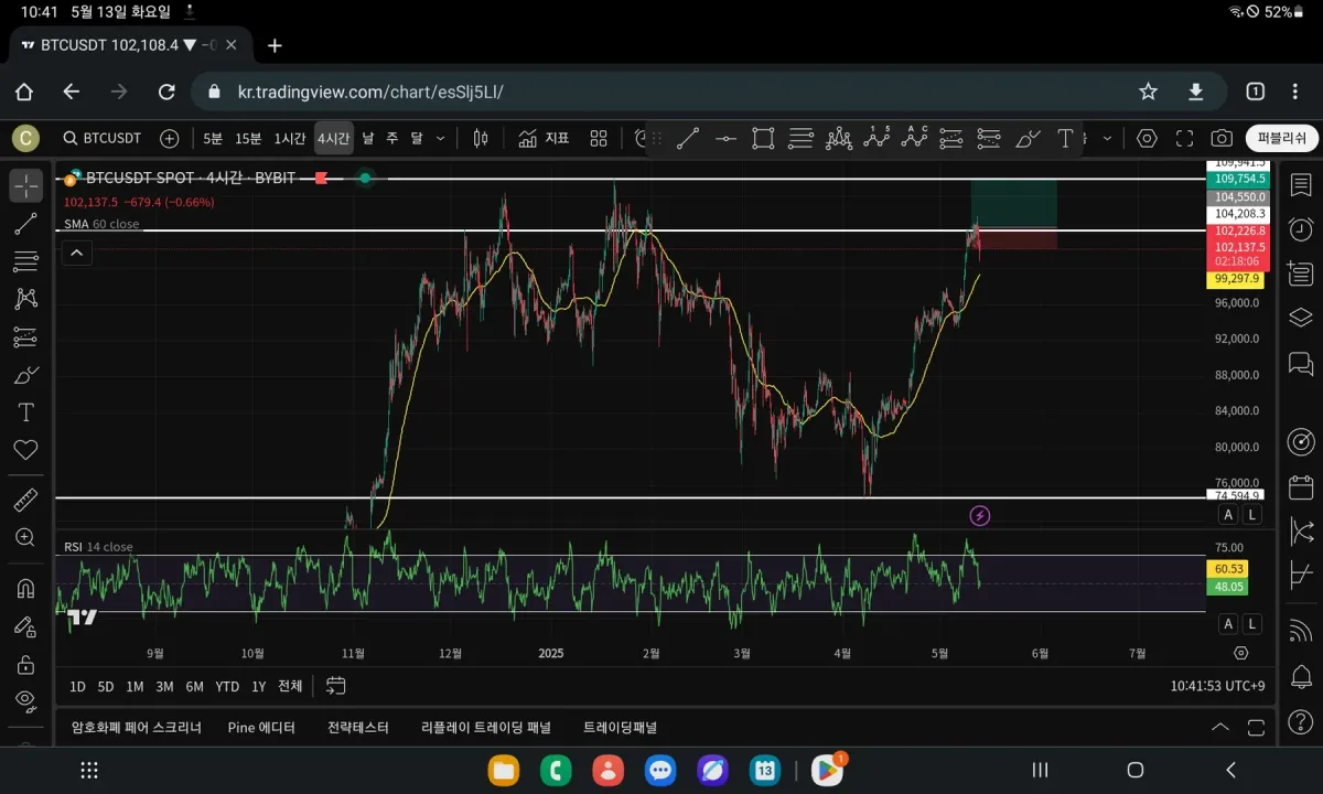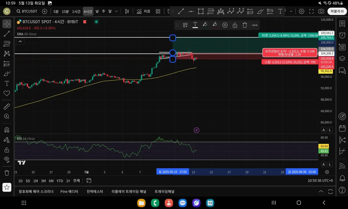 전반적인 방향성이나 큰 틀에서의 분석 의도는 잘 잡으셨습니다. 주봉 60이평 지지, 일봉 더블탑 저항선, 4시간봉 어센딩 패턴이라는 여러 근거를 종합해 매수 시나리오를 세우신 점은 긍정적입니다. 다만 진입과 손절이 너무 촘촘한 자리에서 발생했다는 부분과, 구조 분석의 순서가 조금 서두른 감이 있습니다! ㅠㅠ 현재 차트를 보면 상위 시간봉인 일봉에서 이전 고점 저항을 명확하게 돌파하지 못하고 있고, 오히려 그 자리를 중심으로 윗꼬리를 만들며 다시 밀린 흐름입니다. 특히 두 번째 이미지처럼 4시간봉에서 고점 부근의 음봉 전환이 나왔을 때는 단기 매수세가 약화된 신호로 해석할 수 있었고, RSI도 하락 다이버전스를 보였습니다. 이럴 때는 상방 돌파를 기대하기보다는, 저항대 근처에서 눌림이 확인되고 거래량이 실리는 자리까지 기다리는 것이 더 안전 하실 거에요! 시나리오의 방향은 나쁘지 않았으나 진입 타이밍이 조금 서두른 감이 있고, 상위 구조에서 아직 확실히 돌파하지 못한 상태에서 손절 라인을 너무 가까이 둔 것이 주요 원인입니다. 급하게 반응하지 마시고, 다시 그 자리의 구조를 상위 시간봉부터 차근히 정리해 보시면 좋을 거 같습니다!