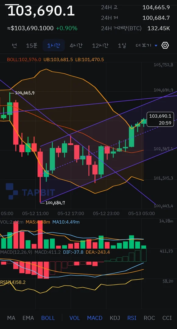 상승 채널 하단 도달 후 하락 추세선 돌파 후 진입.