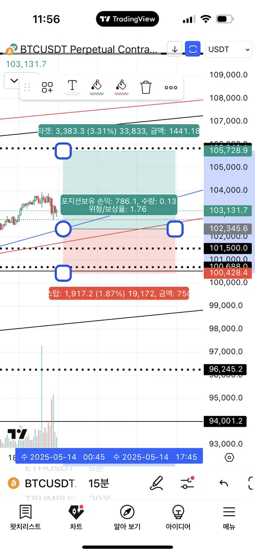 단기 트레이딩으로 15분봉 기준 상승 추세선에 닿을 시 진입 예정 -> 손절/익절 라인 설정하였습니다.