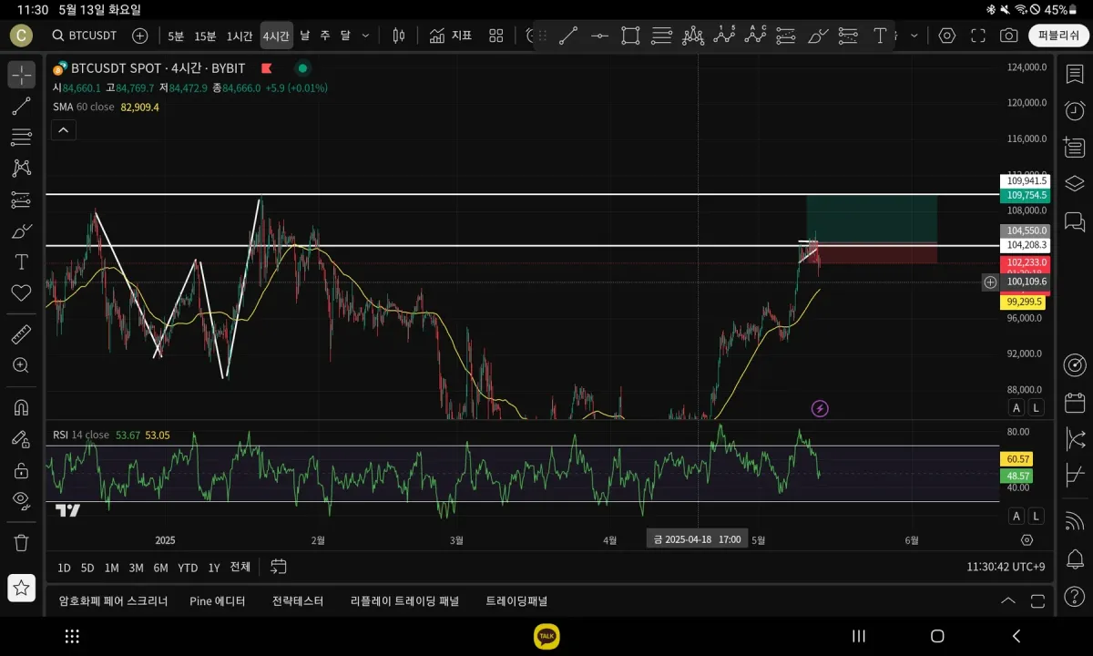 주봉 60 이평선 지지선 / 일봉 더블탑 저항선 / 4시간봉 어센딩 패턴