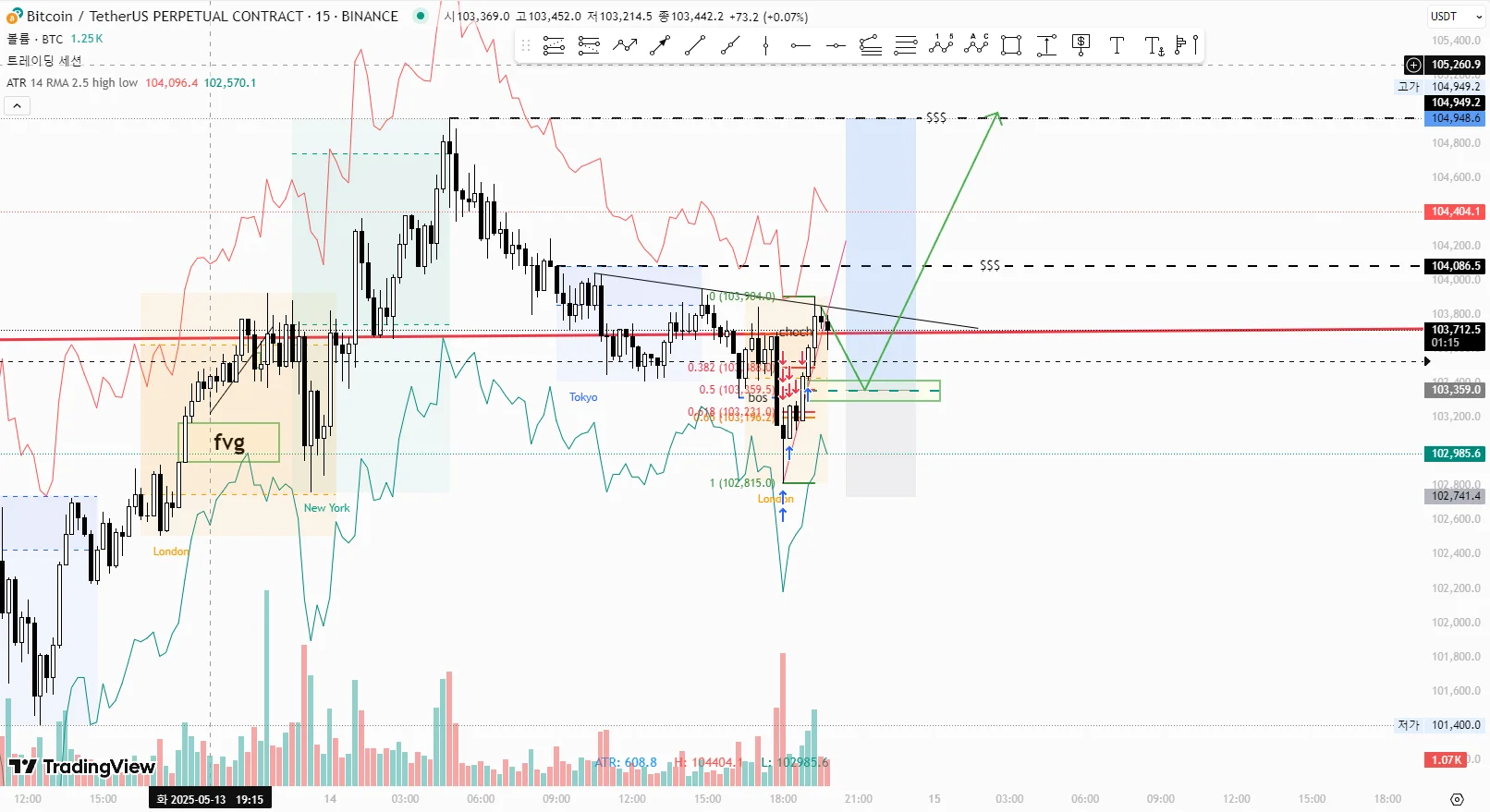 sl은 런던세션의 저점보다 살짝 낮은 102,740으로 잡았습니다. 이는 저의 손절규칙인 atr*2.5 부근입니다.