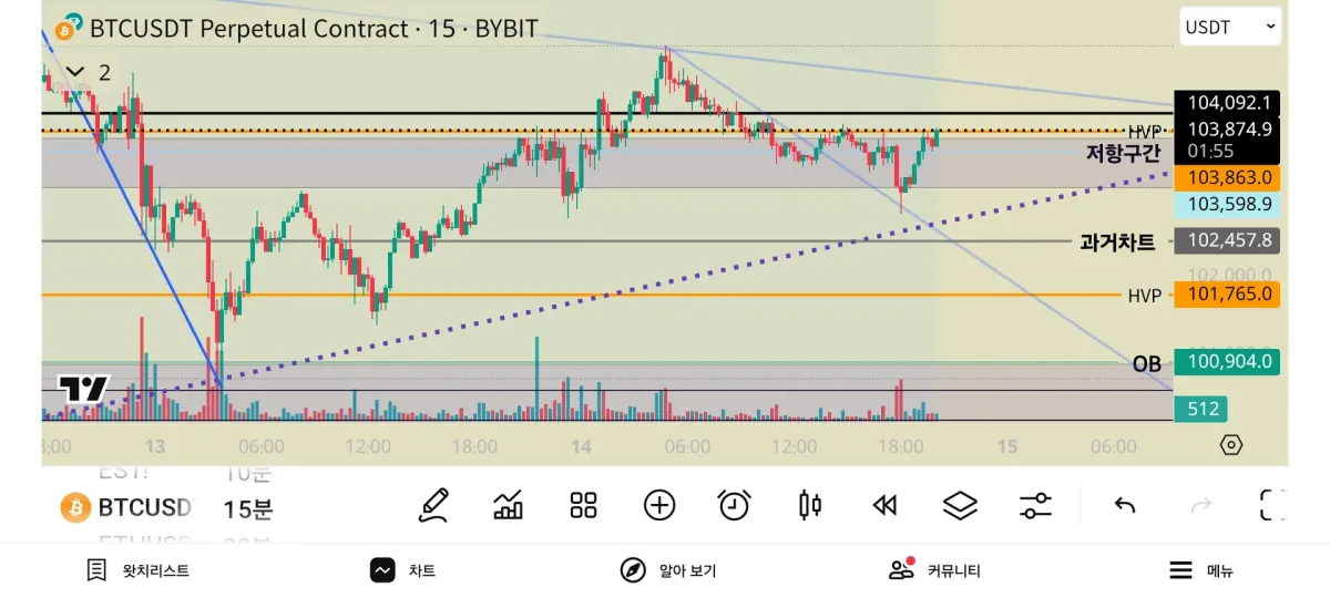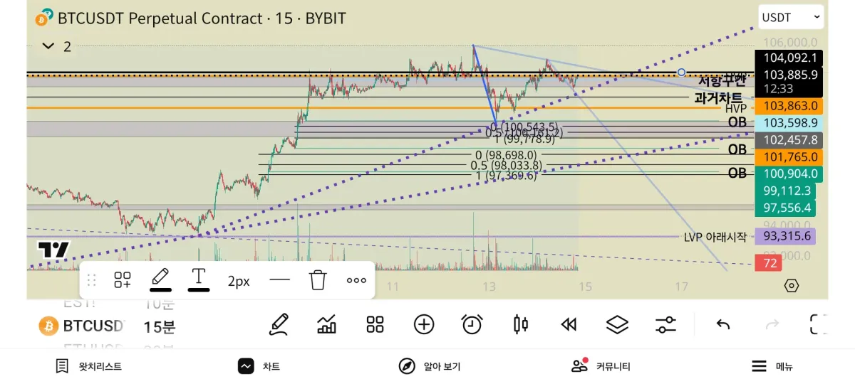 (진입이유) 1. 5분봉 15분봉에 샛별형캔들 출현 2. 옆 캔들의 저점지점 쌍바닥 3. 93k부근 부터 이은 보라색 점선 추세선 (손절 라인) 점선추세선 이탈 (익절라인) HVP로 보는 구간