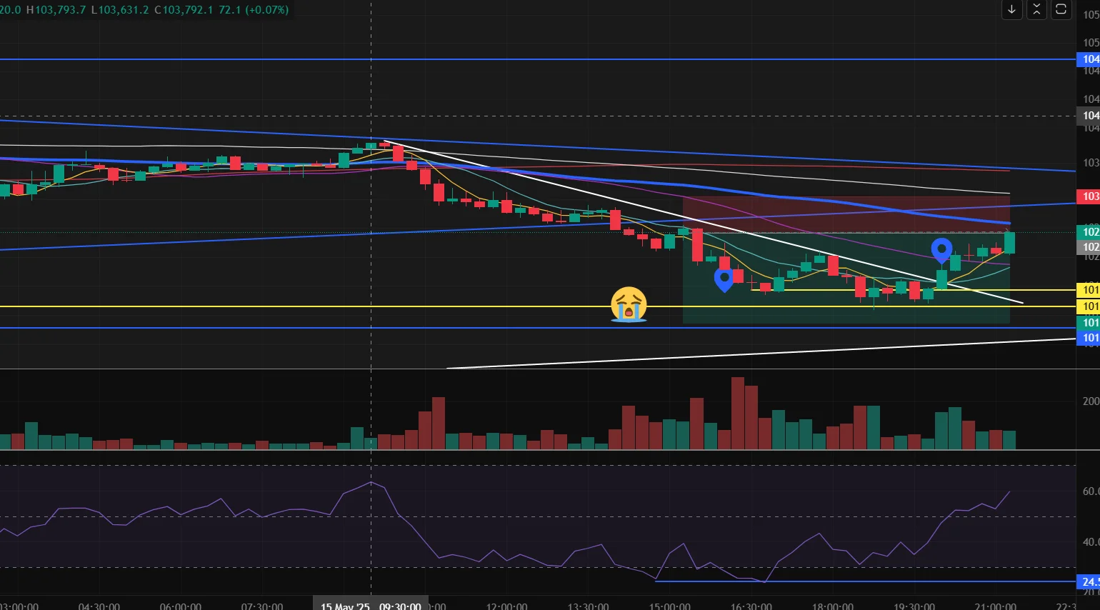 - 주붕부터 일봉, 4시간봉, 1시간봉, 15분봉, 5분봉까지 보며 작도. 파란작도선안에서 삼각수렴이 나와 수렴 이탈시 진입결정을 하기로 했으나 늦은점심식사로 늦게 Short진입(레버리지 20배 절반- 늦게 진입한 만큼 수렴이탈라인인 102,766 근처에서 저항받을 시 나머지 물량 진입예정)함.