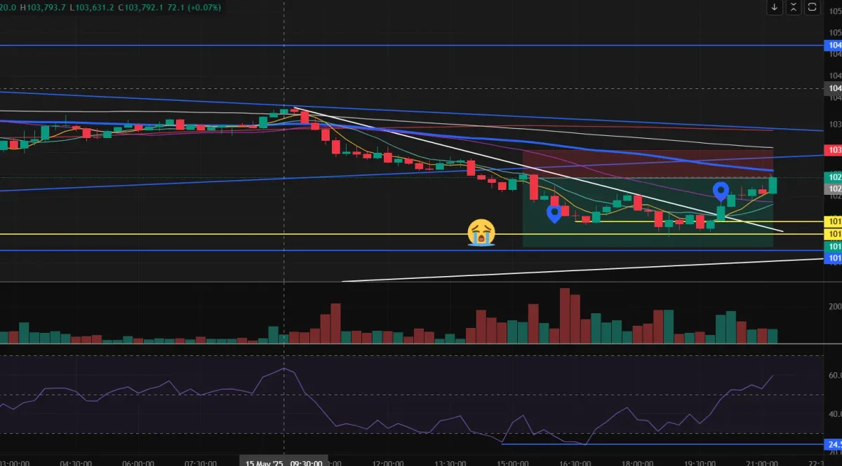 - 주붕부터 일봉, 4시간봉, 1시간봉, 15분봉, 5분봉까지 보며 작도. 파란작도선안에서 삼각수렴이 나와 수렴 이탈시 진입결정을 하기로 했으나 늦은점심식사로 늦게 Short진입(레버리지 20배 절반- 늦게 진입한 만큼 수렴이탈라인인 102,766 근처에서 저항받을 시 나머지 물량 진입예정)함.
