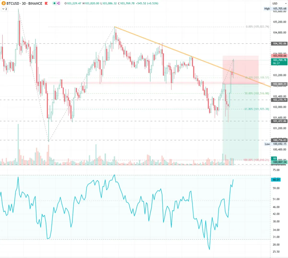 실제로 가격 되돌림이 발생했고 102,827까지 상승했지만 102,900에 걸어둔 지정가 주문을 체결하지 않고 가격이 떨어져서 시장가 주문으로 진입했습니다.