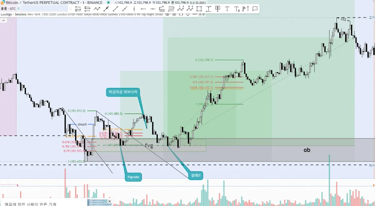 이때 발생한 fvg는 피보나치 0.618과 0.79인 ote와 겹치는 것을 판단하고 진입하기 좋은 자리라고 판단한 후 되돌림이 왔을 때 진입했습니다.