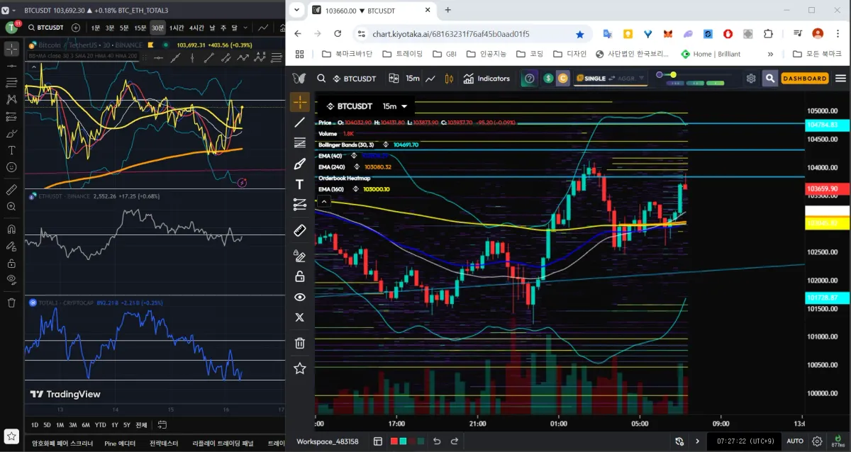 오른쪽 모니터는 비트코인/이더리움/토탈3 [30분차트]+ 키요타카 비트코인 15분 차트