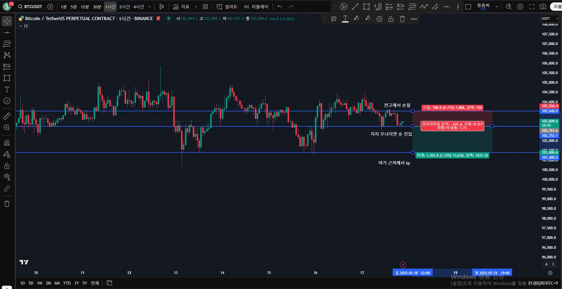 지지 무너지면 숏으로 진입해서, 타켓 까지 손익비 1.73으로 할 계획입니다.