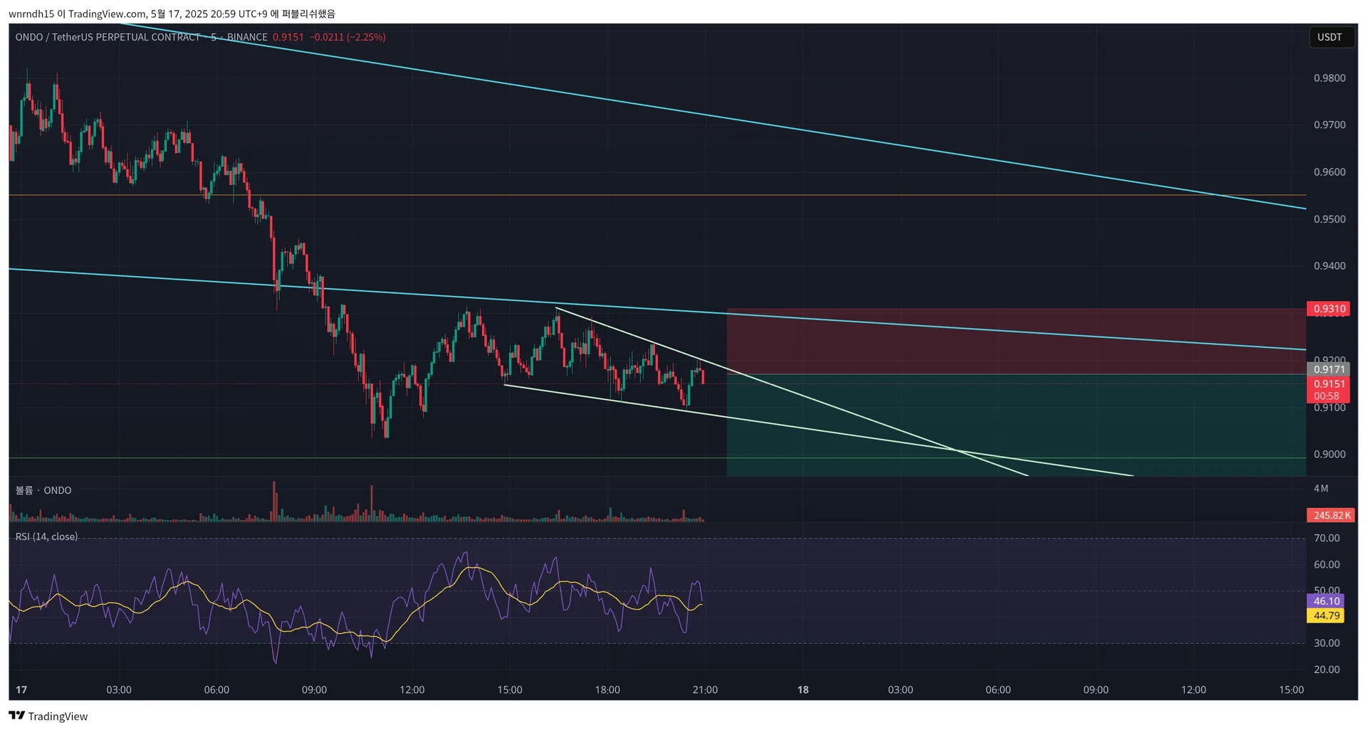 차트를 계속 볼 수 없는 상황이 되어 매매 결과는 이후에 댓글로 남기겠습니다. 진입 : 0.9171 손절 : 0.931 목표가 : 0.89
