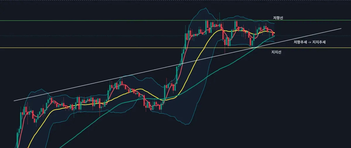 지지선과 저항선이 박스형태로 횡보하는 중입니다.