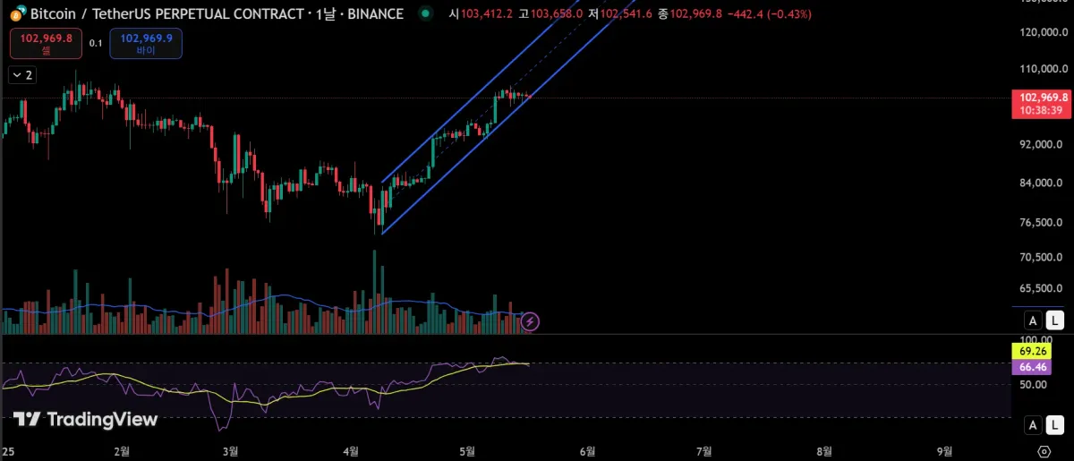 우선 저는 비트코인 일봉상에서 이번 상승 흐름에 따라 패러렐 채널을 만들어 보았습니다.