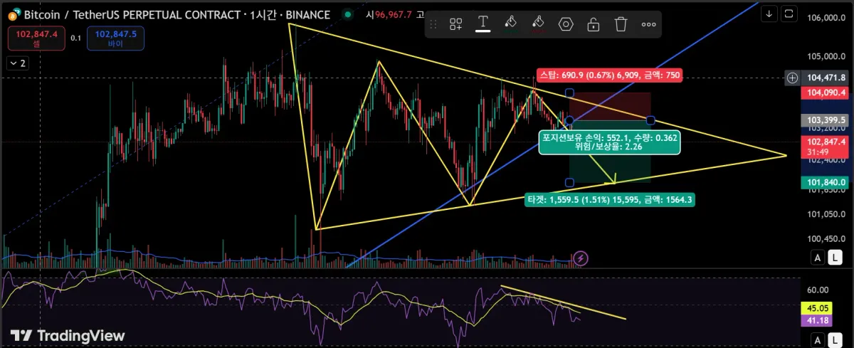 1시간 봉 상에서 (4시간 봉도 참고하였습니다.) 수렴을 보이고 있다는 점을 작도로 확인하였고, 손익비 부분을 체크한 곳을 통해 숏포지션을 진입하였습니다.