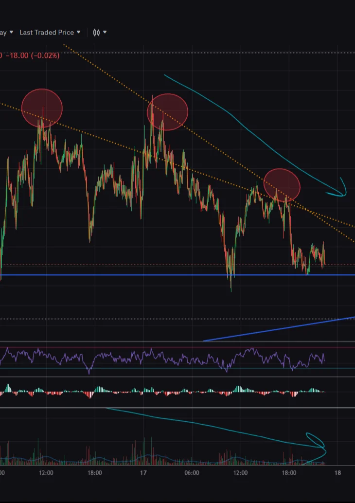 위 5분봉 차트에서는 하락 추세선 (주황색 고점 낮아짐)은 낮아지고 있습니다.