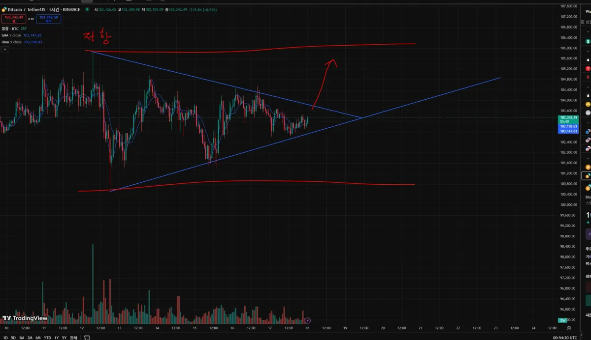 1시간 봉으로 보았을때 중요한 의미가 있는 캔들을 기반으로 작도를 하는 것이 중요하기 때문에 거래량이 많은 음봉을 추세선으로 먼저 작도를 하고 매수세가 높았던 양봉을 기준으로 저항선을 따라 작도해보니 삼각 수렴 구간이 나왔습니다. 2터치 이상이 나왔기 때문에 신뢰도가 어느정도 있는 작도라고 생각하고 삼각 수렴을 벗어나서 2차 저항선을 뚫게 되면 더 높은 상승이 나올 것으로 생각합니다