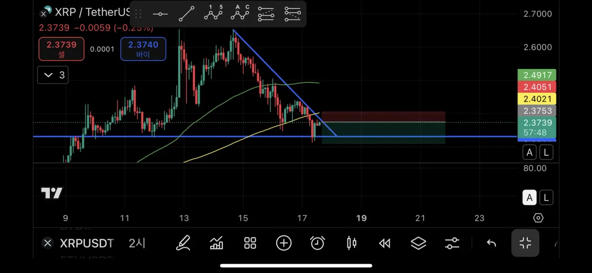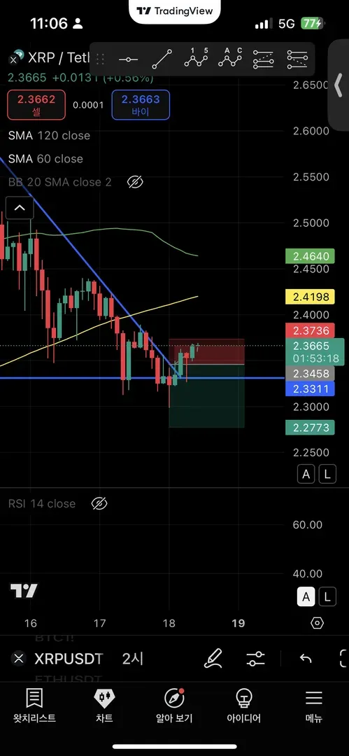 2시간봉 기준 파랑 지지선(2.3311)으로 기준선을 잡았고 디센딩 트라이앵글로 추세선을 그었으며, 이평선(60일, 120일) 지지선을 뚫고 내려왔기 때문에 하방으로 움직일걸로 예상하고 1:2.5의 손익비로 배율 10으로 숏을 침.