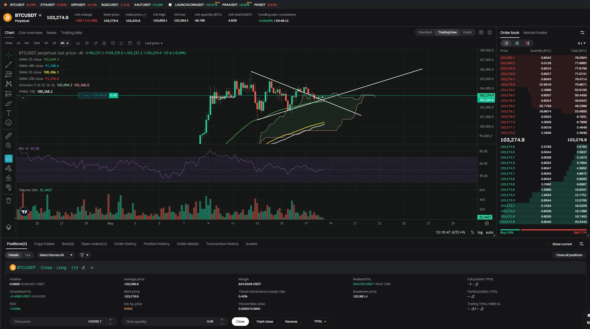 글이 수정이 안되네요 현재 수렴을 기간 조정으로 돌파하는 모습을 보여주고 있는데 초기 계획에서는 수렴 돌파시 진입했었지만 생각보다 추가적으로 상승하는 힘이 부족해서 조금 하락한 모습을 보여주는데 기준이였던 트렌드 라인은 이탈하지 않아서 조금 더 보유해볼 예정입니다.