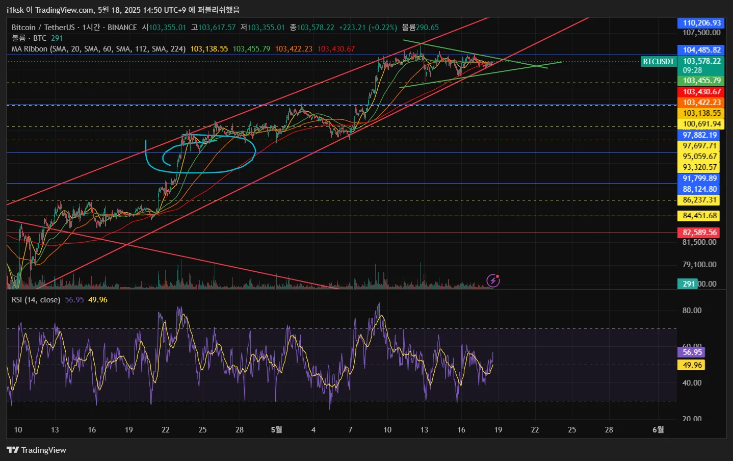 마지막 삼각수렴중인것 같은데 ... 직전 지지선 101000~101500 쯤 내려오면 롱진입해볼 생각입니다