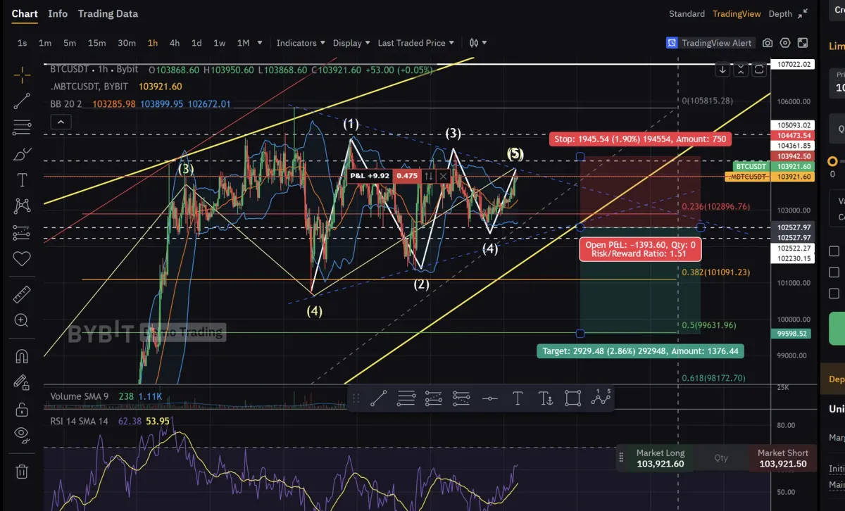 그리하여 단기 추세선을 돌파하며, 피보나치 비율 0.236 아래 부근의 저항선(102522.97)을 기준으로 들어오면 숏포지션으로 시장에 진입하려 합니다. 단기로 진행되기 때문에 0.5(99631.96)을 익절 포인트로, 숏 포디션의 상단 저항선(104477.85)을 손절 포인트로 잡았습니다.