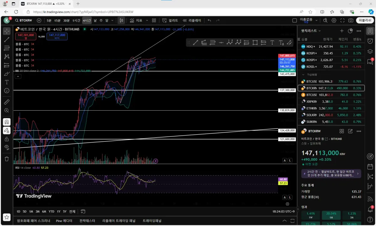 저는 비트코인 현물 137,127,210에 매수하여 현재까지 보유하고 있습니다. 진입근거는 강력했던 저항라인을 뚫고 지지로 바뀌면서 포지션 진입 그리고 수많은 지지 저항을 받은 143,000,000부근에서 익절하려고 하였으나 저항을 뚫고 지지라인을 만들어 주었기에 현재 홀딩중에 있습니다.