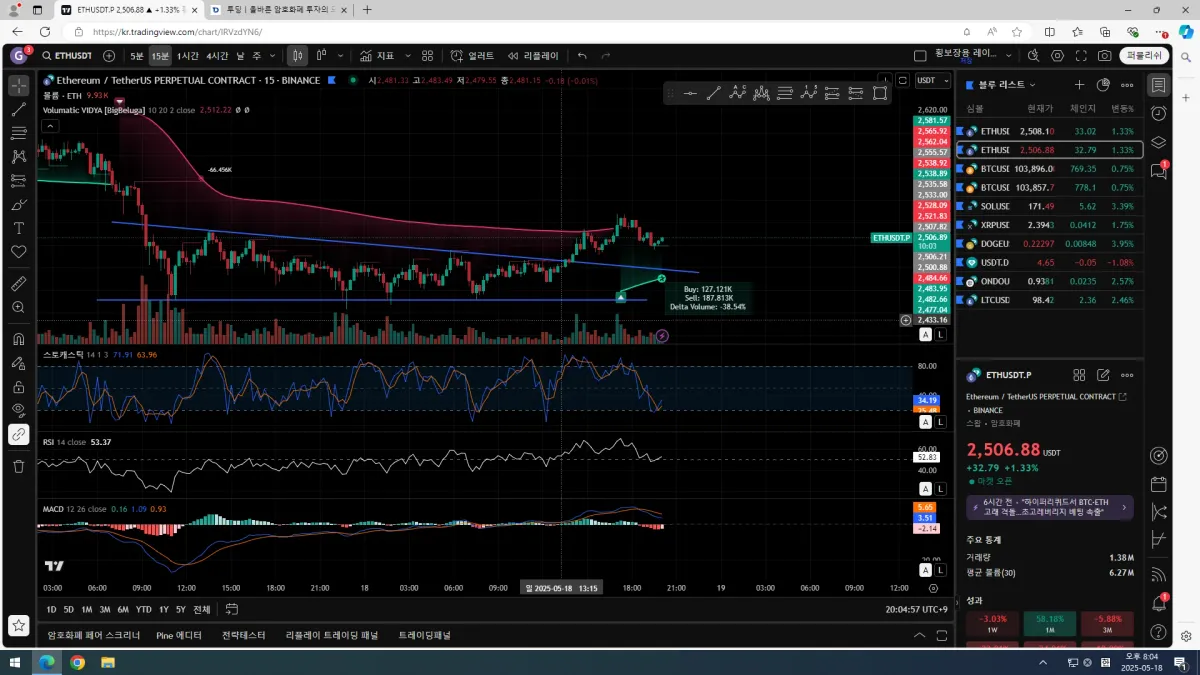 하락 추세선 위로 돌파하려는 모양, 과매도 구간에 진입했던 스토캐스틱, rsi 50이상, macd 파란선 추월 조건 만족으로 진입.