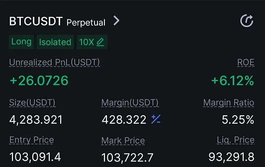 4시간봉으로 본 차트의 모습입니다. 불 플래그와 삼각수렴이 그려지는 자리라고 판단, 103k에서 롱으로 포지션 진입하였습니다.