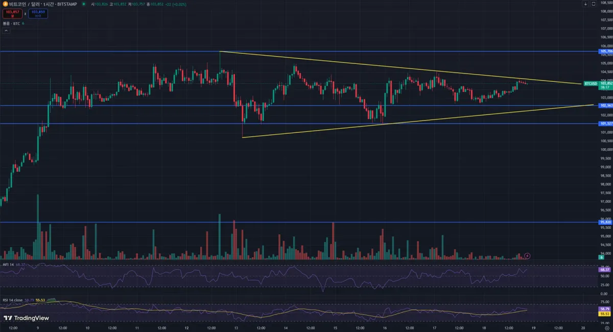 MFI, RSI는 상승 추세이나 삼각수렴 상단에 있는데