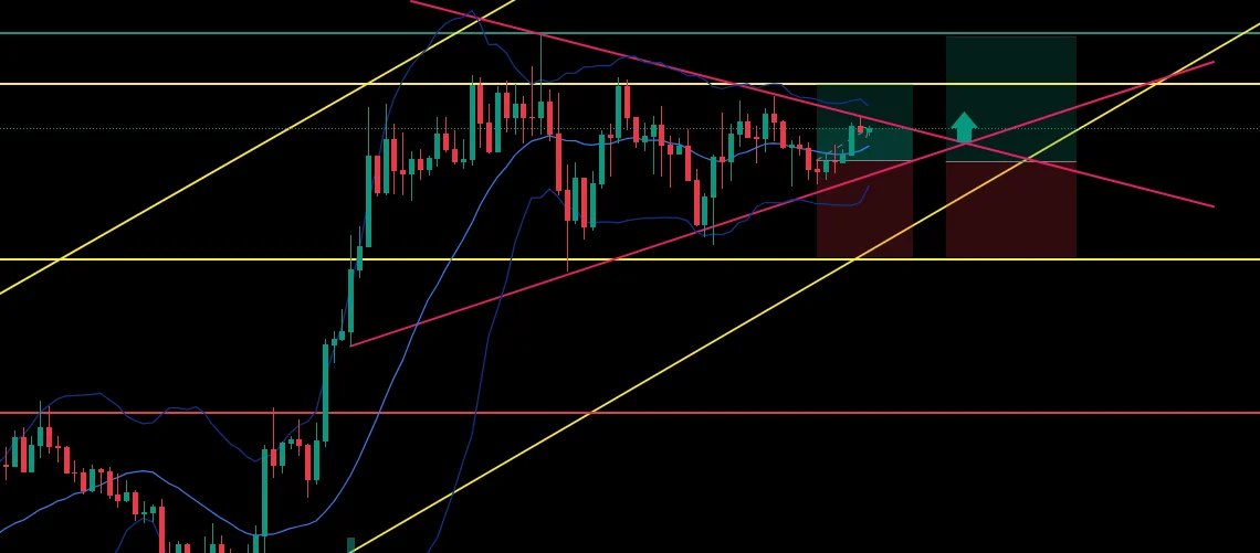 상승 5파 이후에 볼린저 밴드 베이스로 삼각 수렴으로 모아지고 있음. 상승의 지지선을 터치하는 곳으로 가고 있기 때문에 그 부분 가까워지면 지지선을 받고 상승으로 갈 확률이 높아보임. 이에 삼각 수렴 지지선을 손절선으로 잡고 이전 고점을 익절선으로 잡음.