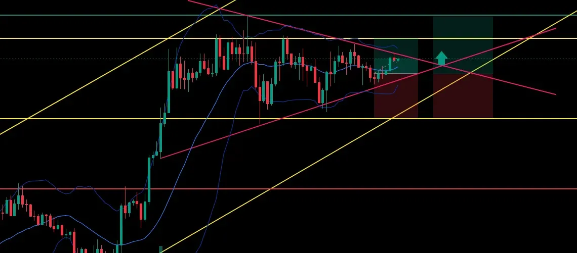 상승 5파 이후에 볼린저 밴드 베이스로 삼각 수렴으로 모아지고 있음. 상승의 지지선을 터치하는 곳으로 가고 있기 때문에 그 부분 가까워지면 지지선을 받고 상승으로 갈 확률이 높아보임. 이에 삼각 수렴 지지선을 손절선으로 잡고 이전 고점을 익절선으로 잡음.