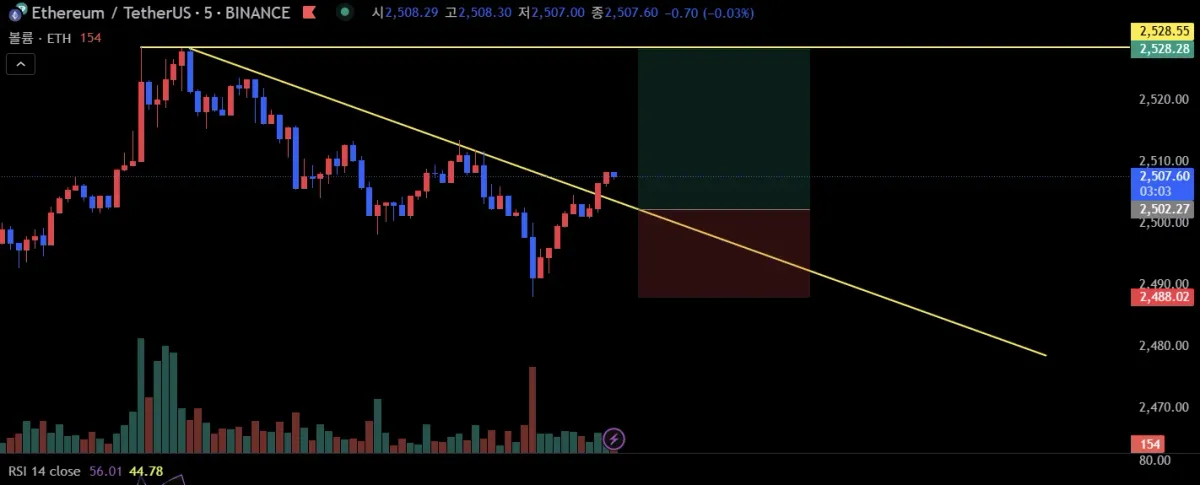 이더리움 5분봉 차트에서 포지션 진입 대기하고 있습니다.