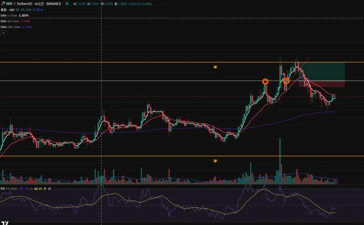 매매이유 : 비트코인이 상승하며 XRP도 같이 시세 펌핑을 받고 있던 와중, 주요 저항대를 두 번 터치하고 내려왔음. 이전 주요 저항을 뚫고, 새로운 지지로 작용한다면 상단 저항까지 받아볼만한 자리라고 생각했음. 손익비도 좋았음. 하지만 실패함.