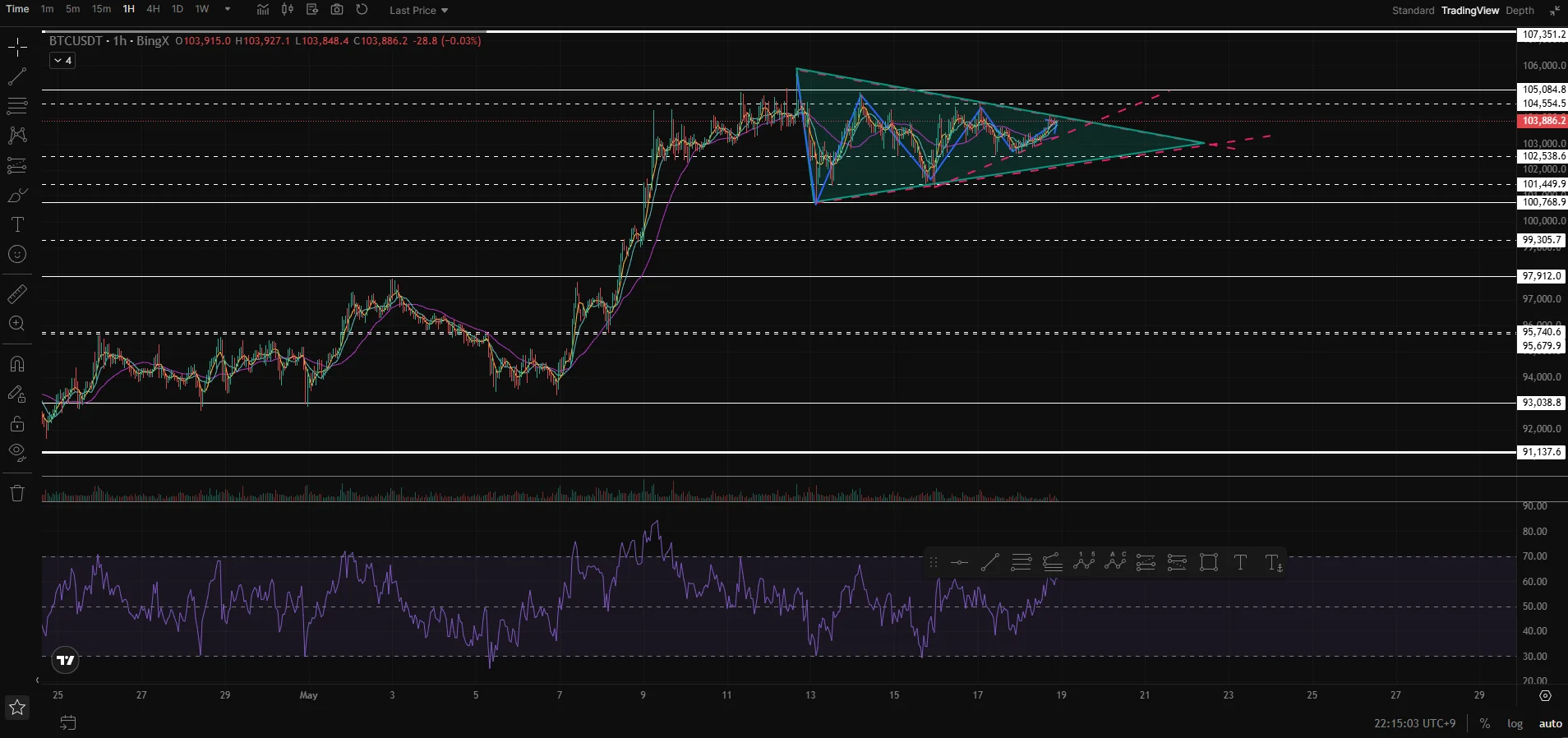 상방 돌파 시 104,600에 롱 진입 107,200 익절 103,400 손절