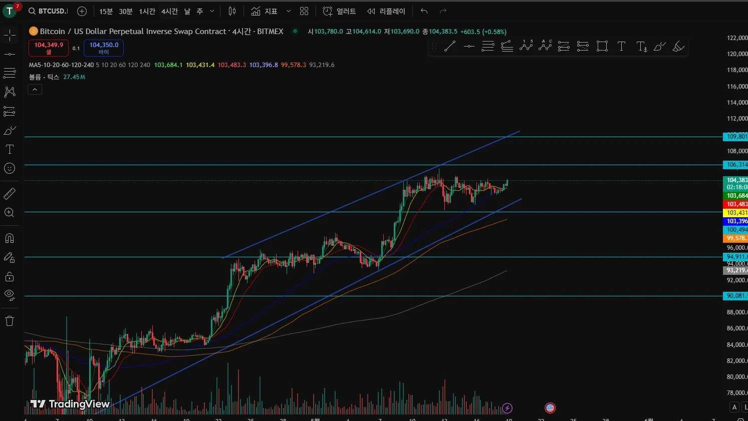 100k 이탈시 94k까지 하락할수도 있으리라 생각하며, 106k 돌파시 109k까지의 가능성