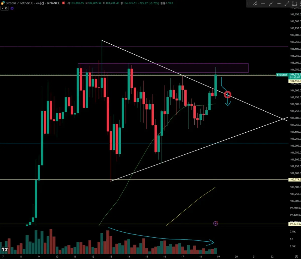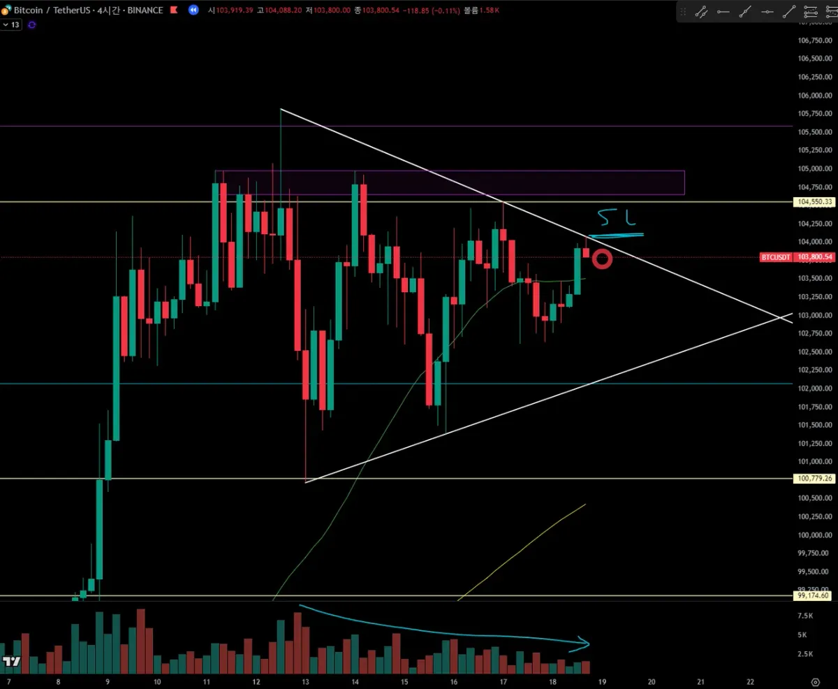 거래량이 줄고 고점과 저점이 낮아지는 삼각수렴을 생각하여 윗꼬리 스탑로스 잡고 숏 진입