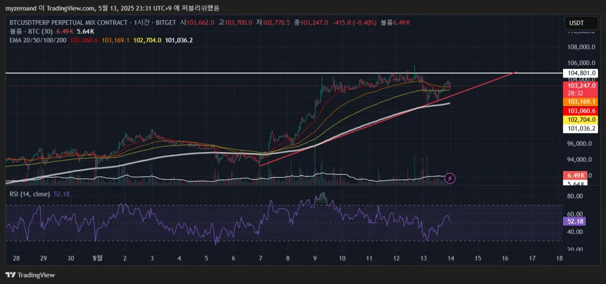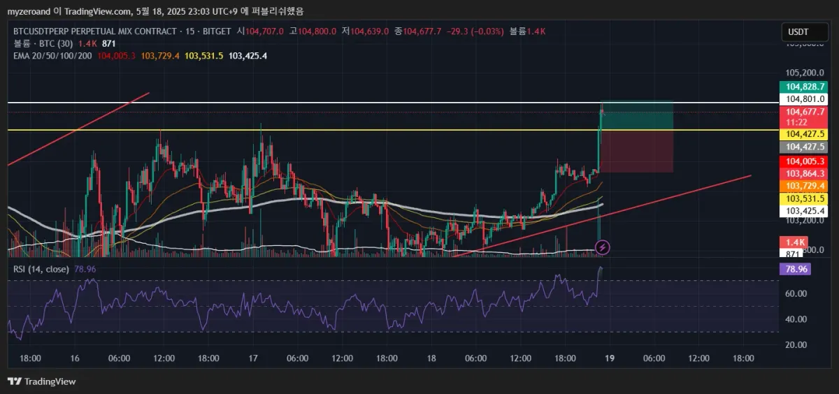 1. 어센딩 트라이엥글이 형성되길 기다리며 진입하려고 주시했는데 하방이탈로 패턴X 2. 장대양봉으로 추세선 돌파예상 -> 진입104485 익절20일선이 100일선 교차시 손절 104,005