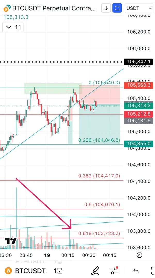 3) 전고점 살짝 위 손절, 전체 상승분의 0.236은 와주지 않을까 생각하여 익절로 잡고 대기 중