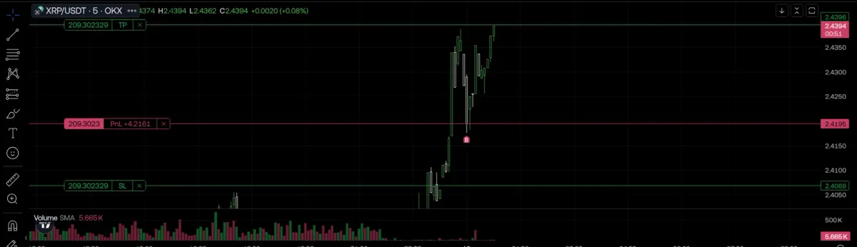 결국 목표 타점까지 찍고 익절로 마무리. 5분봉을 레버리지 없이 1배로 들어가서 수익률이 적음.