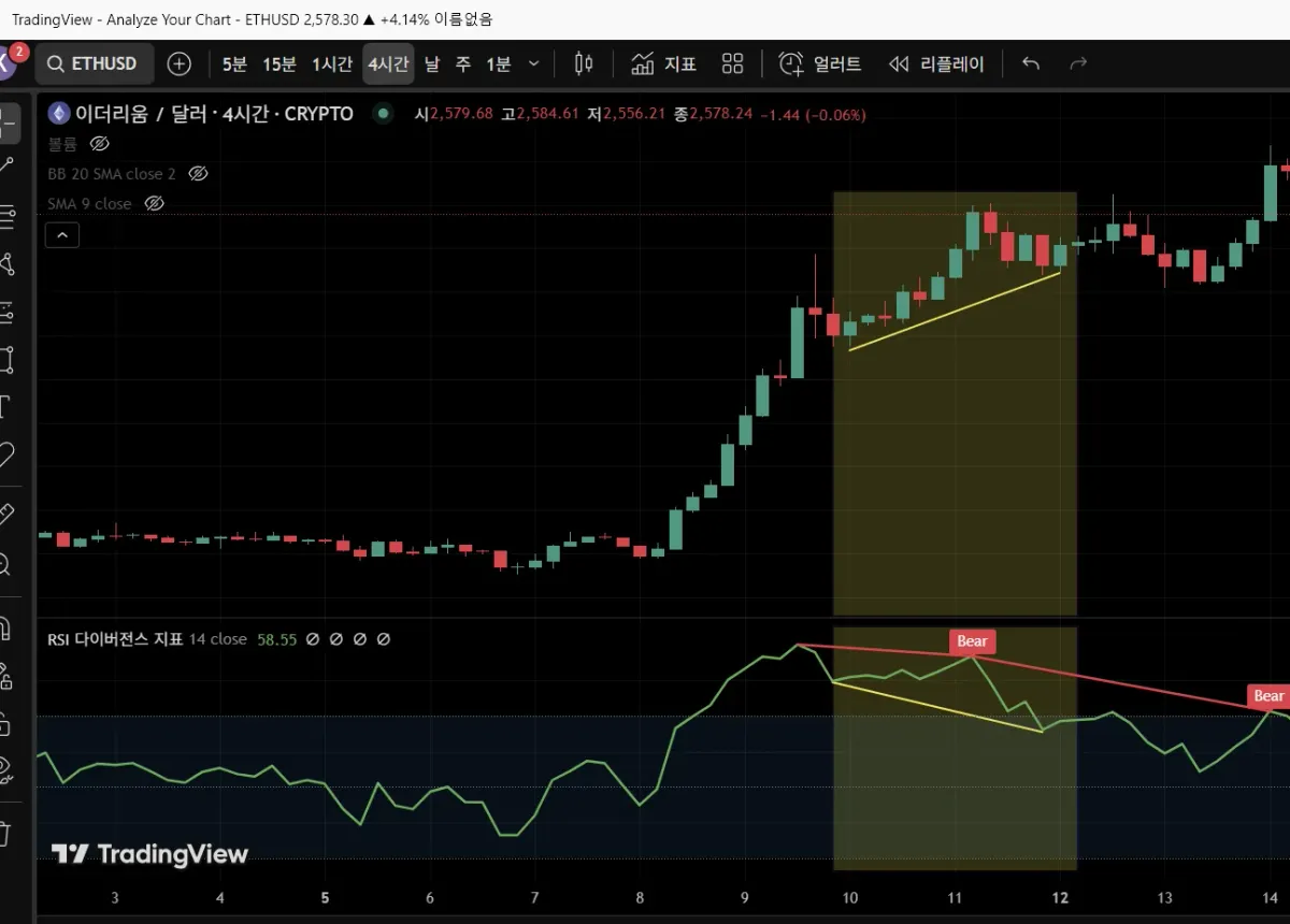 이더리움으로 다이버전스 구간을 찾아보았습니다.