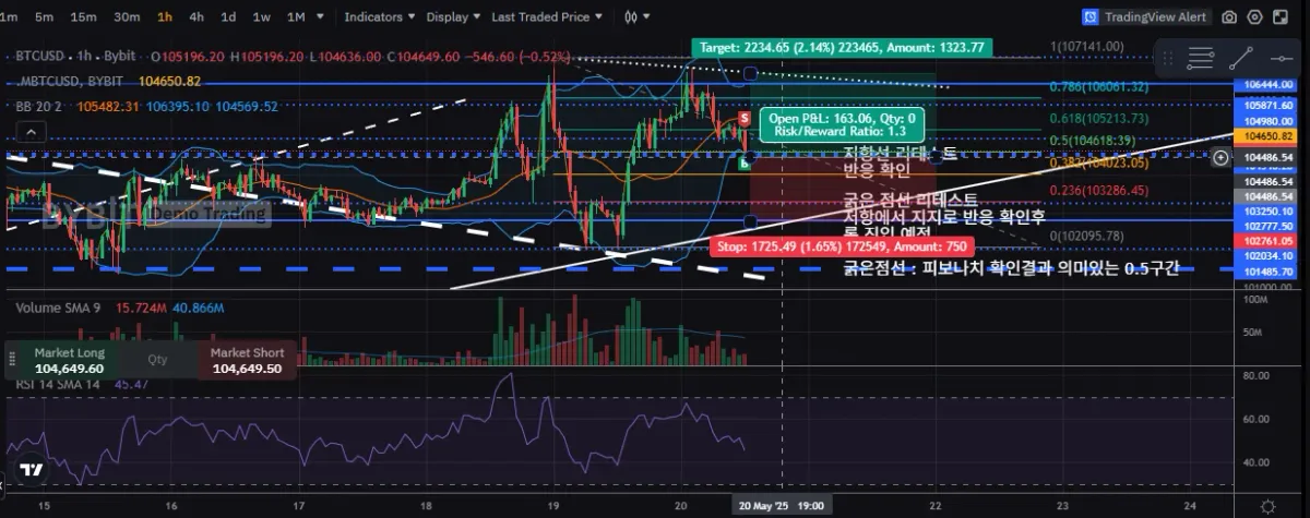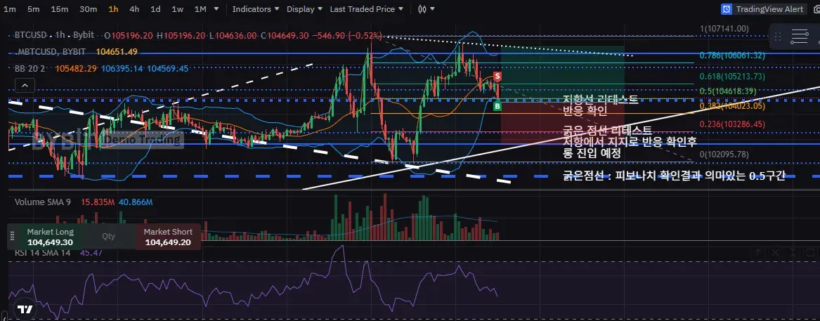 굵은 점선의 리테스트 반응을 확인 후 지지선 역할을 할 시 롱 진입예정 후