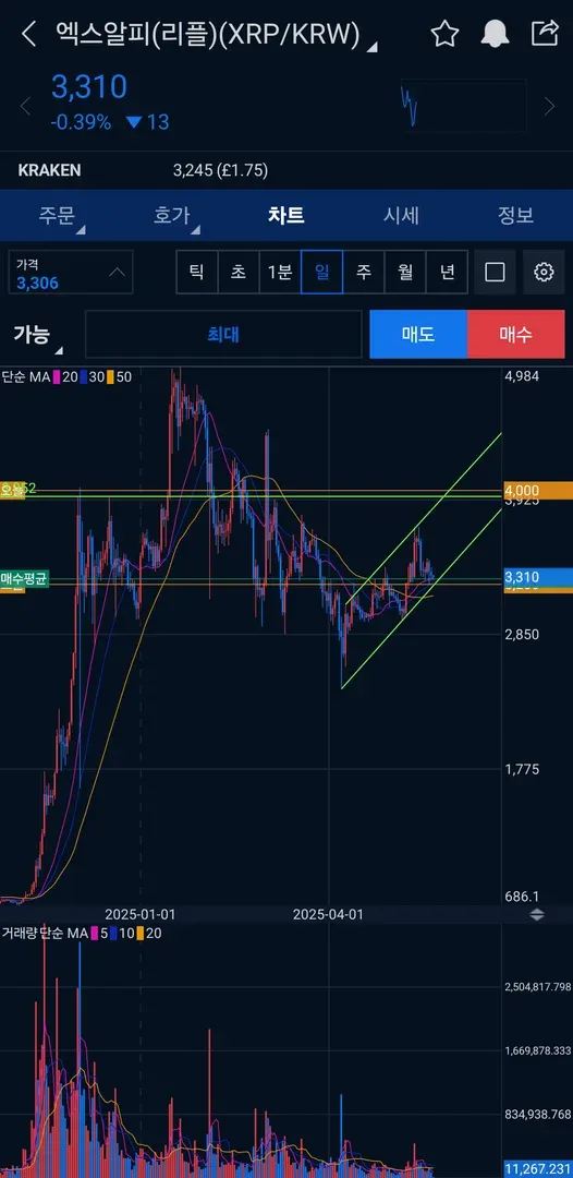 전 고점인 4천까지는 지켜보고 만약 저항선에서 팅겨 내려오면 즉시 판매 계획.