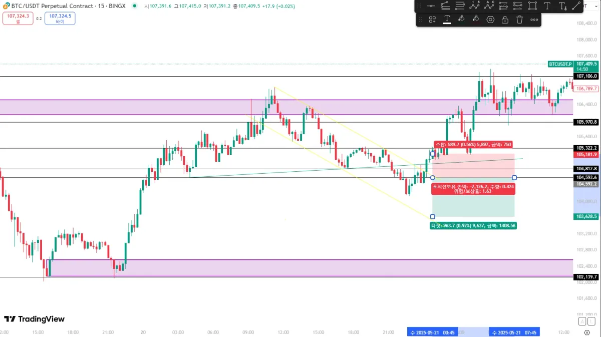 하방으로 3%? 거리 범위 정도 내려갔다가 TP를 못 찍고 올라오는 것을 보고 롱으로 스위칭을 고려했으나 (처음부터 롱과 숏 중에 갈팡질팡한 자리였음)